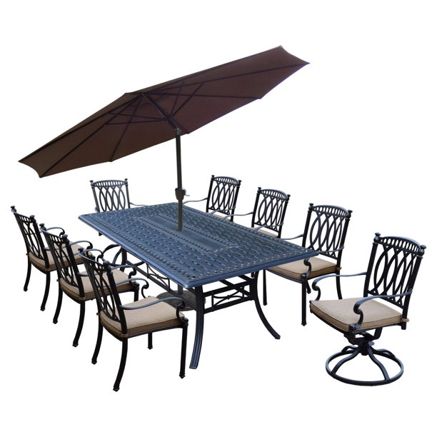 Patio Dining Set With Umbrella Walmart : My Affordable Patio Furniture And Outdoor Decorating Tips - It includes a dining table, four sling folding chairs and a market umbrella.. Great for summer time dinners or conversation with a cocktail in hand Simply order yours now online and have it delivered to your home or pick it up at the store. This round outdoor bistro dining table blends perfectly in any porch, patio, or lawn setting; Best choice products 32in round tempered glass patio dining bistro table w/ umbrella hole. Jun 10, 2021 · lots of patio furniture, patio dining tables and umbrellas are currently in stock at walmart.